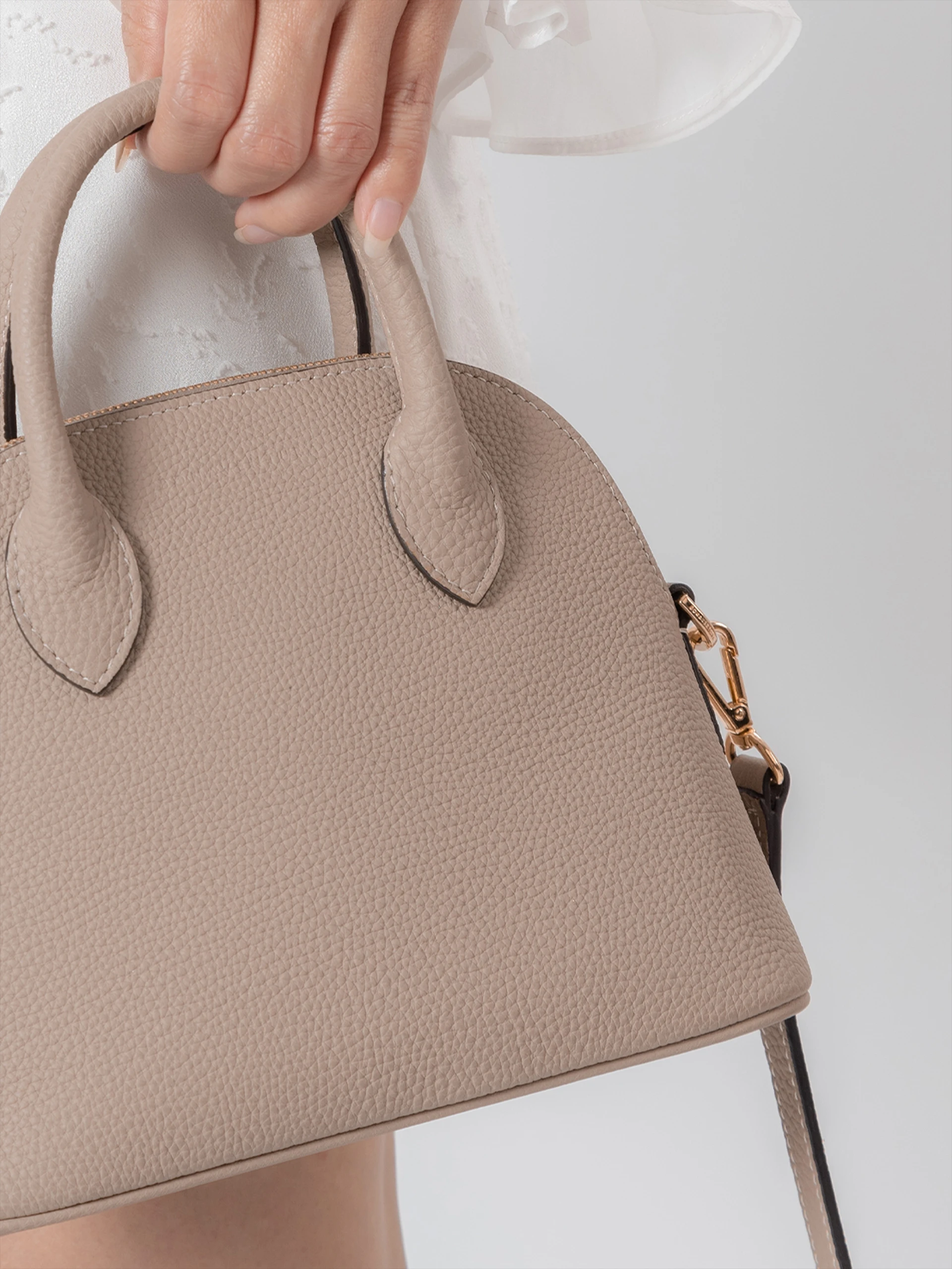 A structured leather handbag with a flat bottom, rounded top, and seashell-inspired details, blending coastal charm with modern elegance.